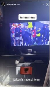 Në një tjetër moment, Bebe ka shpërndarë edhe logon e faqes zyrtare të @albania_national_team, duke treguar se e ka ndjekur me emocion çdo sekondë të ndeshjes dhe se ka qenë mes mijëra shqiptarëve që festuan triumfin.