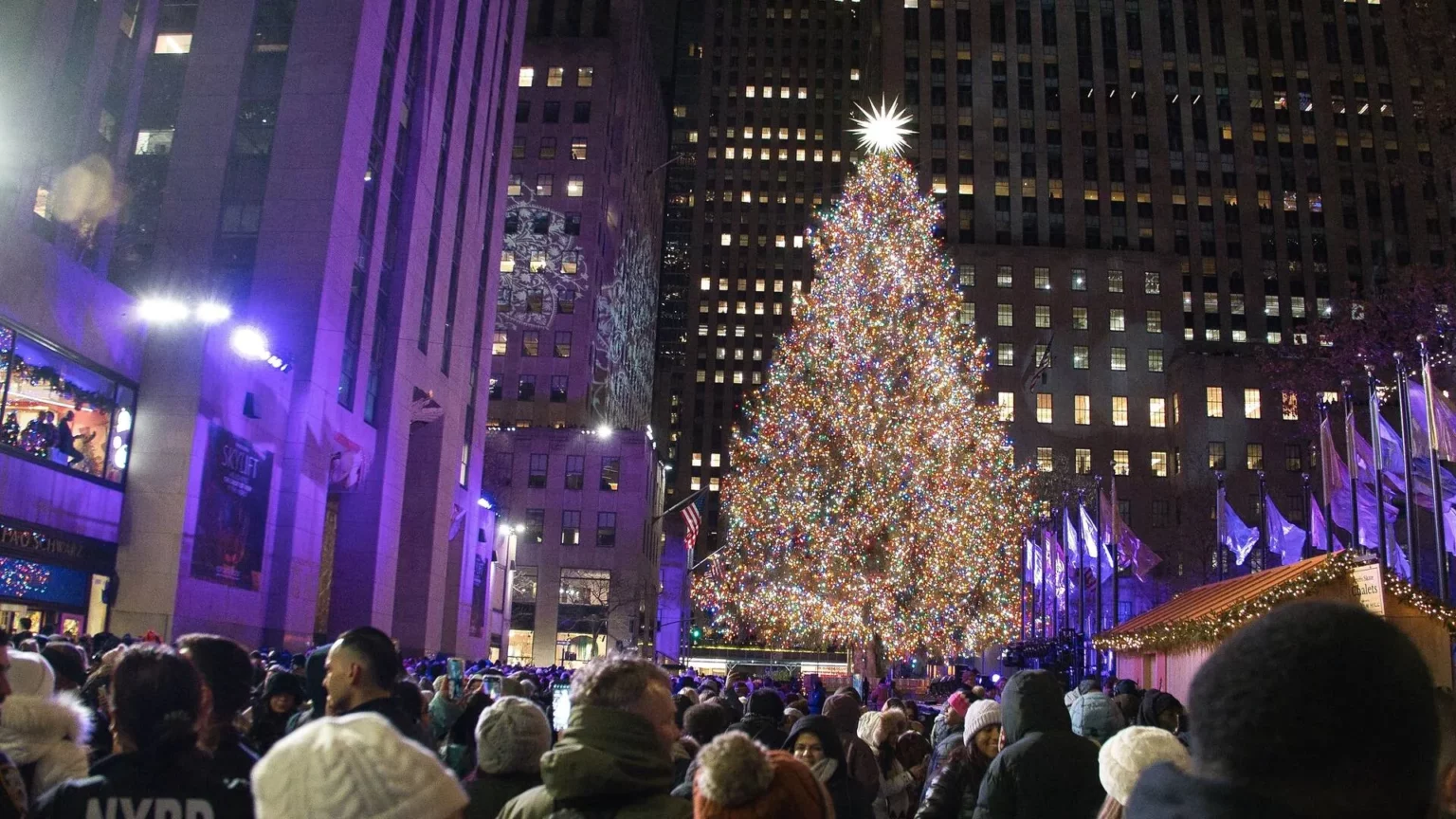 Pema e Krishtlindjeve në Qendrën Rockefeller , një simbol i sezonit të festave të Nju Jorkut, u ndriçua të mërkurën në mbrëmje në Manhattan.