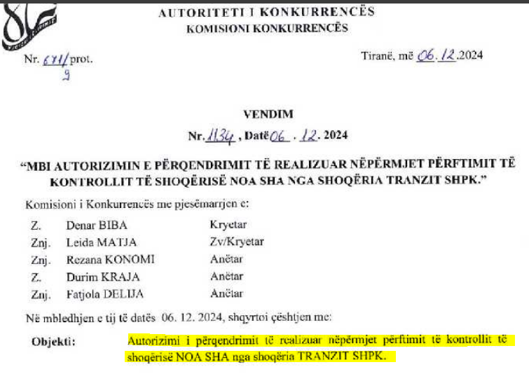Ky është dokumenti i Autoritetit të Konkurrencës që lejon blerjen e NOA-s nga “Tranzit” shpk, i firmosur nga Denar Biba, njeri shumë i besuar i kryeministrit Rama.