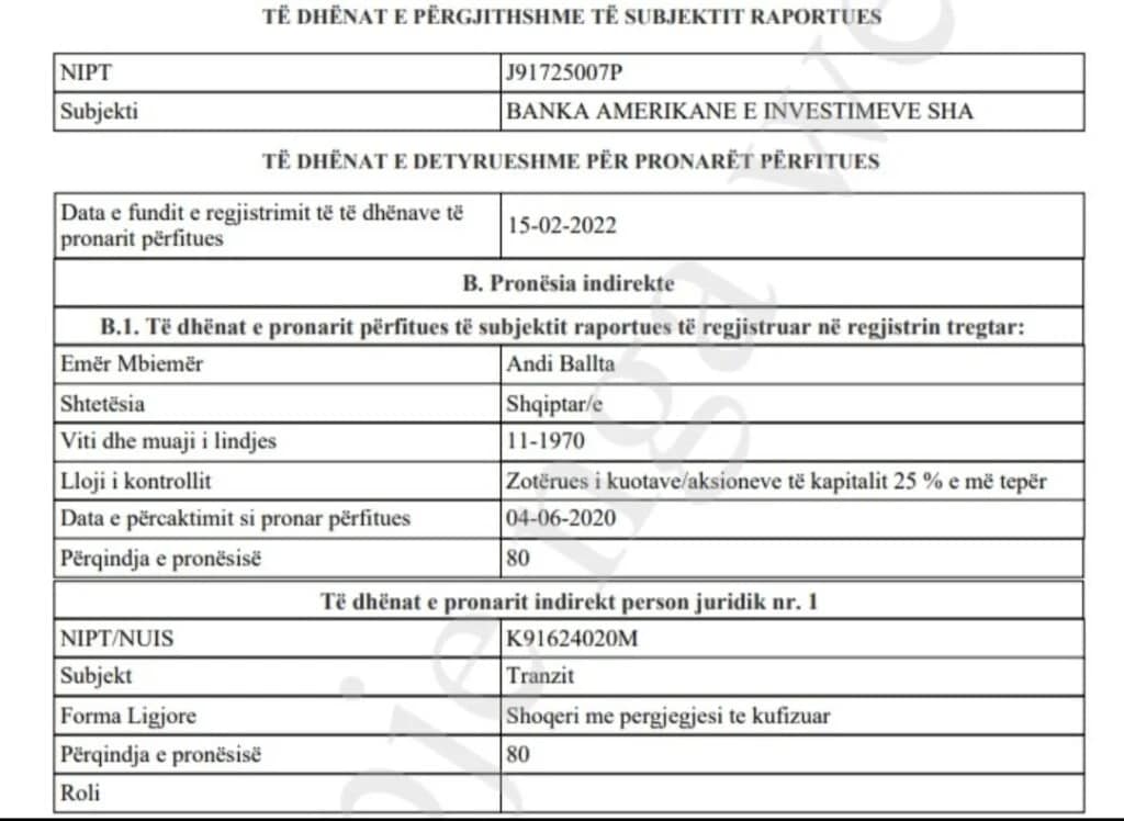 Struktura e pronësisë, që të çon te CEO Andi Ballta dhe dy fondet e regjistruara në Ishujt Kajman, e menaxhuara nga NHC, e bën të pamundur të përcaktohet përfituesi final dhe ndikimi i tyre real në vendimmarrjen e bankës. Legjislacioni i Ishujve Kajman nuk lejon publikimin e identitetit të aksionarëve që mund të detyrojnë institucionet financiare të kryejnë praktika “të papërshtatshme”, përfshirë pastrim parash.