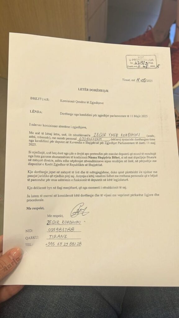 Por duket se kjo dakordësi mund të mos zbatohet. Kjo pasi kandidati i Nismës Thurje në listën e mbyllur në Tiranë, Zeqir Kordhoni, ka depozituar në KQZ kërkesën për t’u njohur me letrën e dorëhqjes që koalicioni ka dorëzuar në emër të tij para zgjedhjeve të 11 majit.