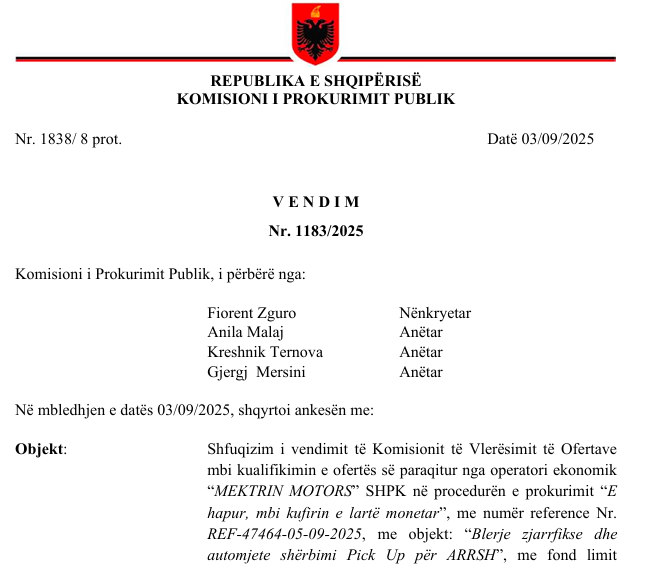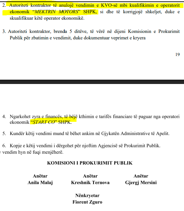 Në këto kushte, Qendro përdor fuqinë politike mbi KPP-në dhe e përmbys tenderin duke urdhëruar skualifikimin e fituesit. Vendimi është marrë më datë 3 shtator 2025 duke pranuar kërkesën e Qendros për “Shfuqizimin e vendimit të Komisionit të Vlerësimit të Ofertave mbi kualifikimin e ofertës së paraqitur nga operatori ekonomik “MEKTRIN MOTORS” SHPK”.