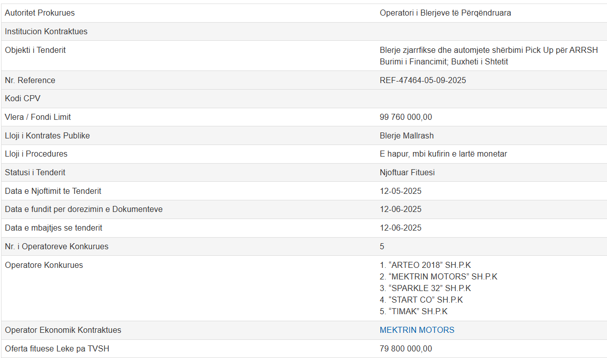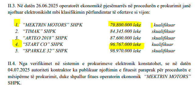 Nga verifikimet në sistemin e prokurimeve elektronik konstatohet, se në datën 4 korrik 2025 autoriteti kontraktor ka publikuar njoftimin e fituesit paraprak për procedurën e mësipërme të prokurimit, duke shpallur fitues operatorin ekonomik “MEKTRIN MOTORS” SHPK. Oferta fituese ishte 79 800 000,00 lekë pa TVSH.