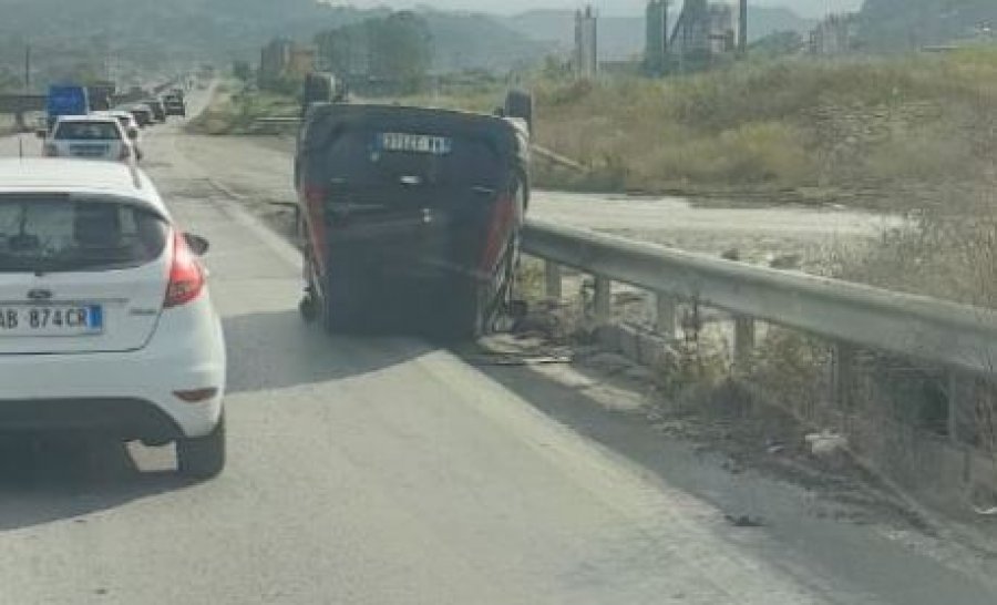 Aksident në Durrës-Tiranë, automjeti përplaset me trafikndarësen dhe përmbyset në rrugë