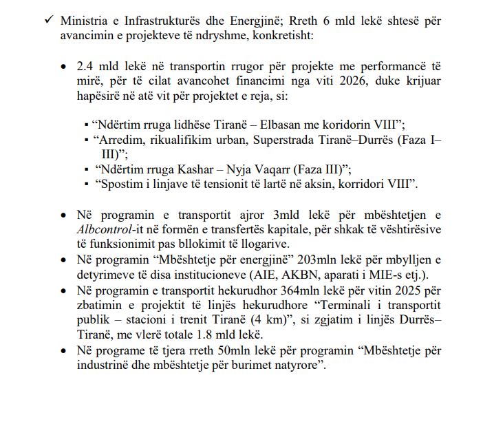 24 milionë euro nga buxheti që i bëhet Ministrisë së Infrastrukturës shkojnë për transportin rrugor, me qëllim përshpejtimin e disa projekteve si ndërtimi i rrugës lidhëse Tiranë–Elbasan me korridorin VIII; Arredimi dhe rikualifikimi urban i Superstradës Tiranë–Durrës (Faza I–III); Ndërtimi i rrugës Kashar–Nyja Vaqarr (Faza III); Spostimi i linjave të tensionit të lartë përgjatë korridorit VIII.
