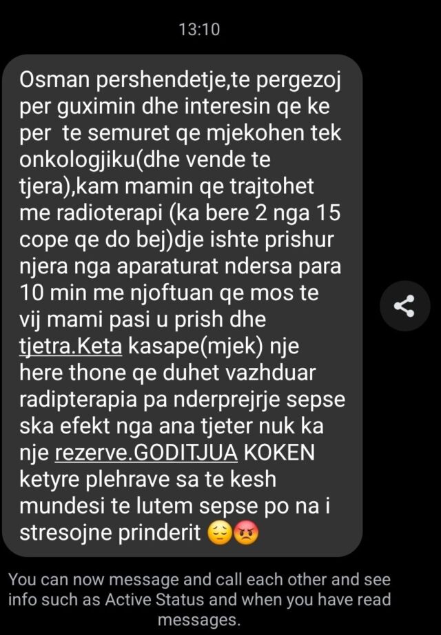 Gazetari Osman Stafa ngre alarmin për situatën kritike në Spitalin Onkologjik, ku prishja e Akseleratorit Linear 2 po ndalon trajtimin e pacientëve me kancer.