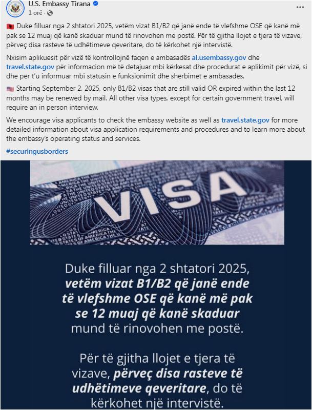 Ambasada e Shteteve të Bashkuara në Shqipëri ka bërë të ditur përmes një postimi në rrjetet sociale se nga data 2 shtator 2025 do të hyjnë në fuqi rregulla të reja për procedurat e vizave.