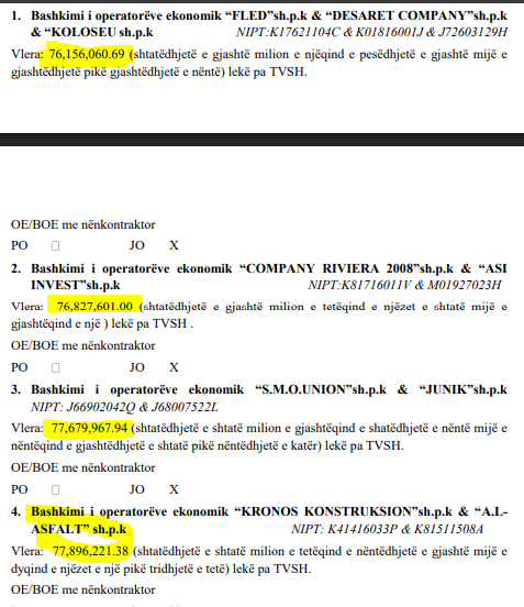 Theksojmë se bashkimi i operatorëve ekonomik “FLED”sh.p.k & “DESARET COMPANY”sh.p.k & “KOLOSEU sh.p.k propozoi ta bënte riparimin e rrugës me vlerë 76,156,060 lekë pa TVSH. Po ashtu, bashkimi i operatorëve ekonomik “COMPANY RIVIERA 2008”sh.p.k & “ASI INVEST”sh.p.k kishte ofertë më ekonomike 76,827,601.00 lekë pa TVSH.