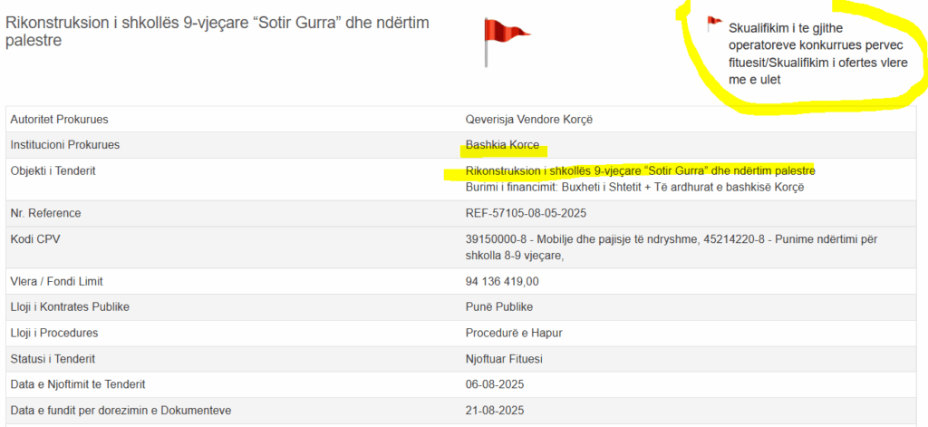 “Skualifikim i të gjithë operatorëve konkurrues përveç fituesit/ Skualifikim i ofertës me vlerë më të ulët”, kështu është klasifikuar nga Open Data Albania tenderi i firmosur nga Sotiraq Filo. Madje procedura është qëndisur me një “Flamur të kuq”.