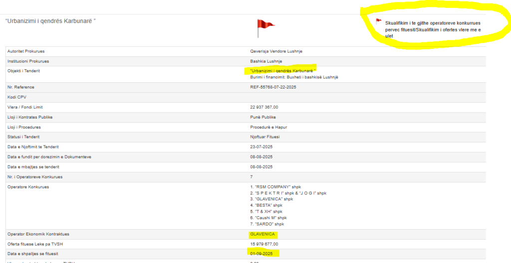 Ndërkohë në datën 1 shtator 2025, “GLAVENICA” shpk kishte marrë nga kryetarja e Bashkisë Lushnjë, Eriselda Sefa, kontratën 230 milionë lekë “Urbanizimi i qendrës Karbunarë ”.