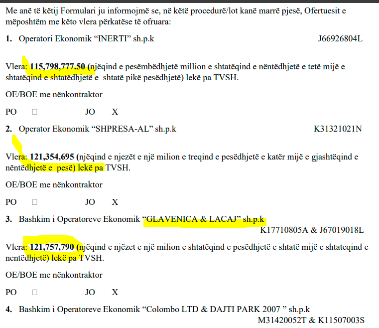 Përfitues është bashkimi i operatorëve “GLAVENICA” shpk & “LACAJ” shpk, përfaqësuar nga firma “Glavenica” me pronar Lavdimir Baraj, me ofertë 121 757 790,00 lekë pa TVSH.  Por, sipas dokumentit të mëposhtëm, kishte kompani të tjera që bënë propozime më ekonomike.