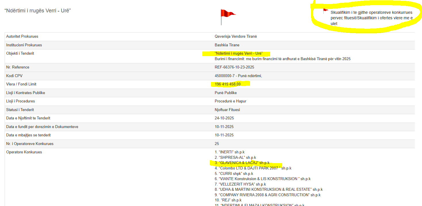 Më konkretisht, e kemi fjalën për prokurimin e Bashkisë Tiranë me objekt “Ndërtimi i rrugës Verri – Urë”. Procedura është shënuar me “Flamur të kuq”, që sinjalizon riskun e korrupsionit.