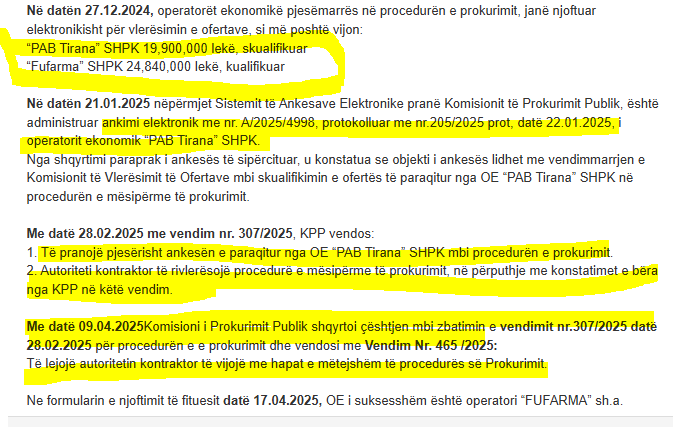 Në datën 27 dhjetor 2024, operatorët ekonomikë pjesëmarrës në procedurën e prokurimit, janë njoftuar elektronikisht për vlerësimin e ofertave. “PAB Tirana” SHPK me ofertën 19,900,000 lekë është skualifikuar ndërsa “Fufarma” SHPK me propozimin arrogant me vlerë 24,840,000 lekë ishte kualifikuar.