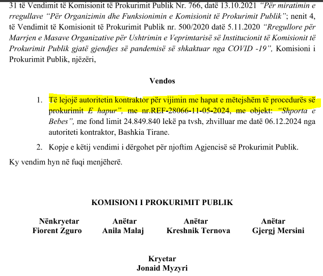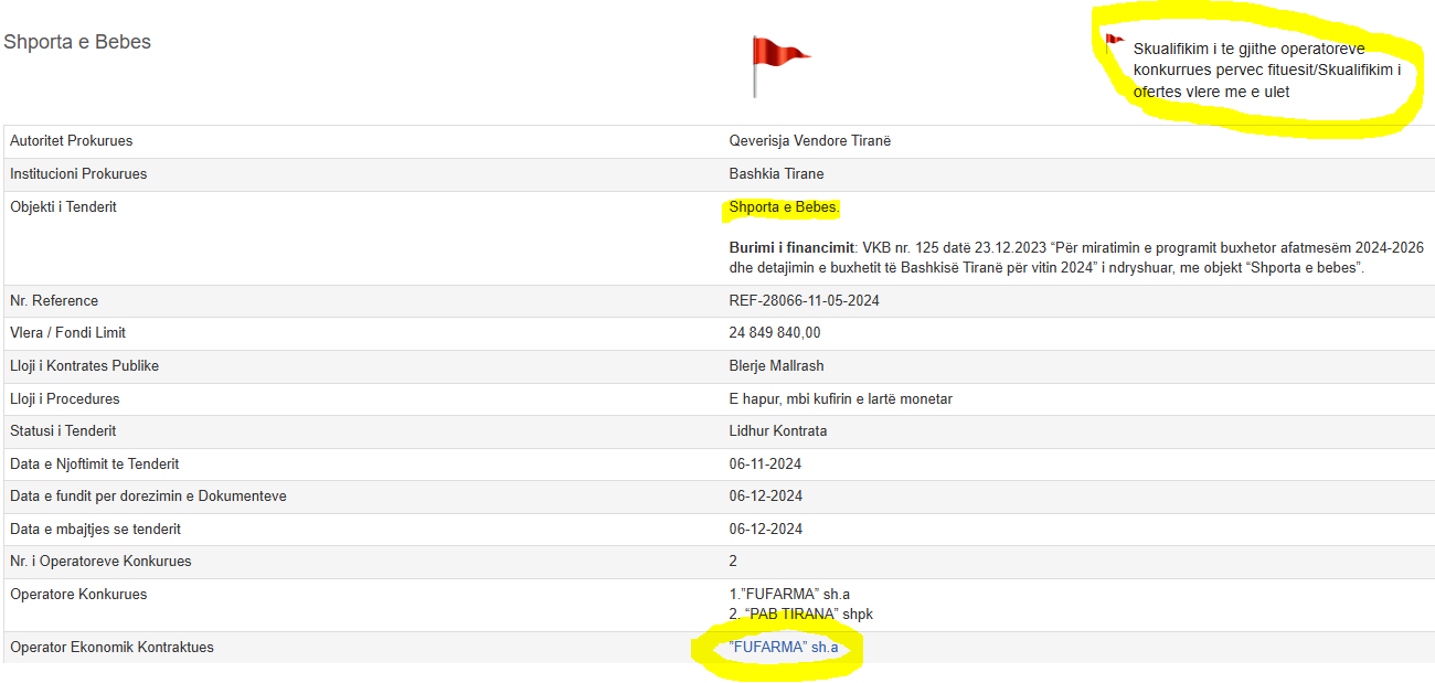 Konkretisht tenderi me objekt “Shporta e bebes” me fond limit 24 849 840,00 lekë është hapur më 6 nëntor 2024 dhe është mbajtur më 6 dhjetor 2024.