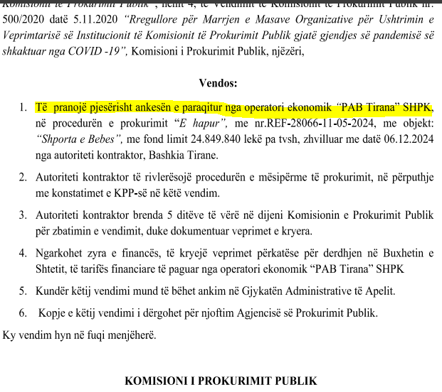 Me datë 28 shkurt 2025, KPP vendosi “Të pranojë pjesërisht ankesën e paraqitur nga OE “PAB Tirana” SHPK mbi procedurën e prokurimit”. Bashkia Tiranë urdhërohej të rivlerësojë procedurën e mësipërme të prokurimit.