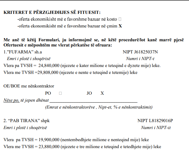 Në këtë procedurë u regjistruan dy operatorë konkurrues “FUFARMA” sh.a e Isuf Berberit dhe “PAB TIRANA” shpk.