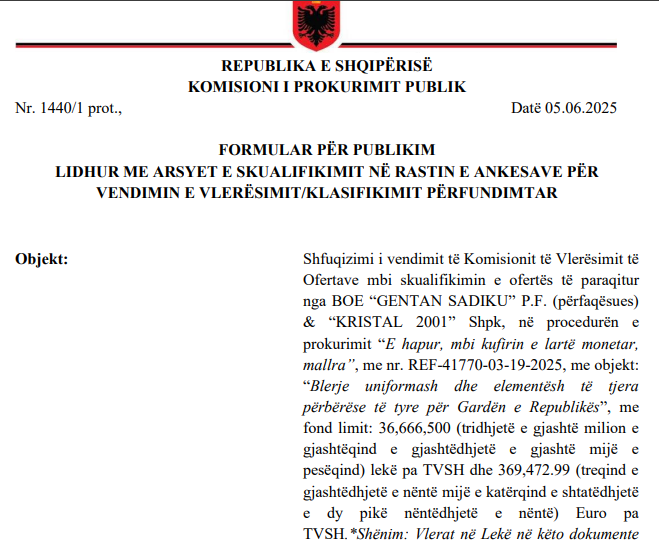 Proceduar e prokurimit është denoncuar në Komisionin e Prokurimit Publik nga kompania “Kristal 2001” dhe Gentian Sadiku (person fizik) të cilët kundërshtojnë si të padrejtë vendimin e komisionit për skualifikimin e tyre. Deri në marrjen e një vendimi nga KPP, pazari për tenderin e uniformave të gardistësve do të mbetet pezull.