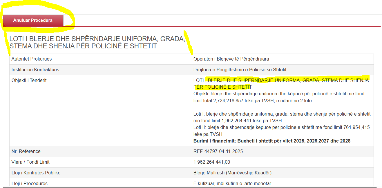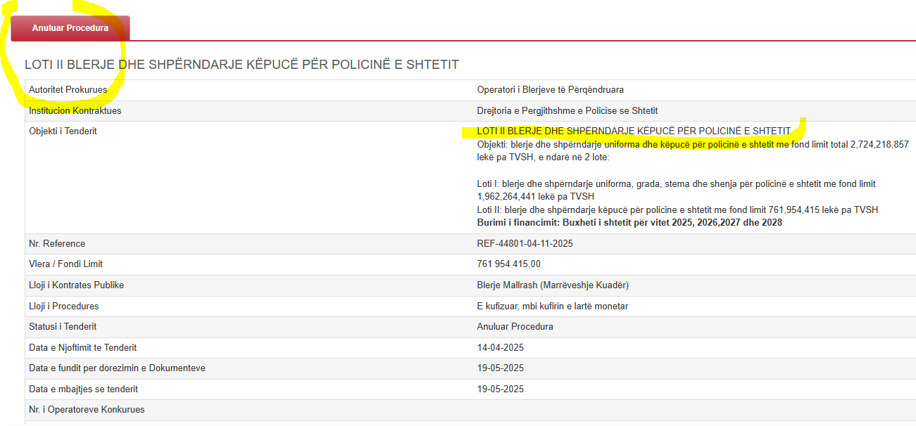 Ndërkohë Operatori i Blerjeve të Përqendruara kishte shpallur tenderin për blerjen e uniformave për Policinë e Shtetit. Gara ishte e ndarë në dy lote, dhe ofertat për secilën priteshin deri më 19 maj 2025. Por ç’ndodhi? Me një shkresë të Drejtorit të përgjithshëm të Policisë së Shtetit, Ilir Proda është anuluar tenderi. Loti i parë ishte me vlerë 19.6 milionë euro dhe parashikonte blerjen e uniformave, gradave, stemave dhe shenjave për Policinë e Shtetit. Sipas dokumenteve të tenderit do të bliheshin 78.150 uniforma bazë për policinë, si dhe 4.545 kostume bazë (këmishë, jelek, pantallona, kapele etj), për rreth 12 mijë punonjës policie gjithsej.
