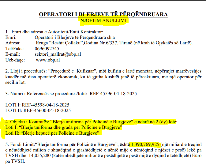 Në një informacion shtesë nga Operatori i Blerjeve të Përqendruara theksohet se “Procedura e prokurimit anulohet me kërkesë të Autoritetit Kontraktor përfitues Drejtoria e Përgjithshme e Burgjeve, sipas shkresës nr.8600 prot, datë 03.06.2025 me lëndë “Kërkesë për anulimin e procedurës së prokurimit me objekt “Blerje uniforma për Policinë e Burgjeve” e ndarë në 2 (dy) lote”.