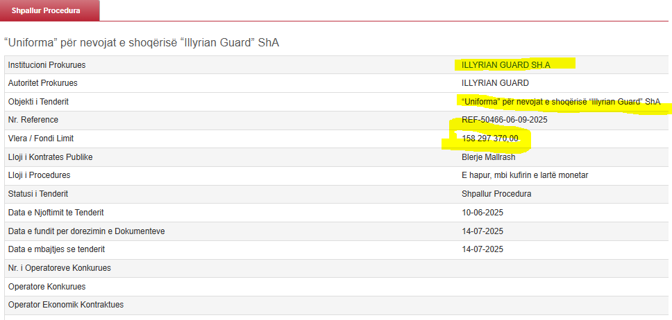 Tenderi i shpallur për prokurimin e këmishave me mëngë, pelerinave dhe pantallonave ka një fond limit rreth 1.6 miliardë lekë pa tvsh. Banushi e njoftoi tenderin në Agjencinë e Prokurimit Publik më 10 qershor 2025, ndërsa data e fundit për dorëzimin e dokumenteve është lënë 14 korriku. Pra, leku letër për këta policë privatë, ndërsa do të anuloheshin tenderat për veshjen e Policisë së Shtetit.