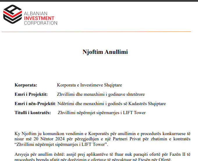 Projekti i dytë që është anuluar është “Ndërtimi dhe menaxhimi i godinës së Kadastrës Shqiptare”. Ndërsa titulli i kontratës është “Zhvillimi nëpërmjet sipërmarrjes i LIFT Tower” Korporata ka marrë vendim për anulimin e procedurës konkurruese të nisur më 20 Nëntor 2024 për përzgjedhjen e një Partneri Privat për zbatimin e kontratës “Zhvillimi nëpërmjet sipërmarrjes i LIFT Tower”.