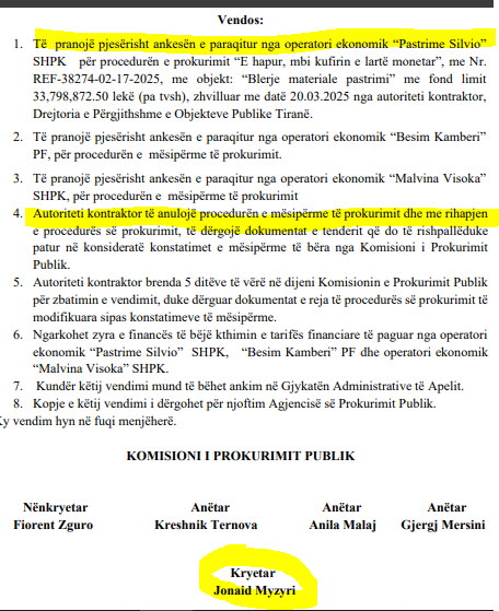 Siç do ta shohim më poshtë, personi që është shkelur në kallo nga ky vendim është i fuqishëm. Kështu, më 27 qershor 2025, KPP nën drejtimin e Jonaid Myzyrit vendosi ta rrëzojë tenderin duke kërkuar anulimin.