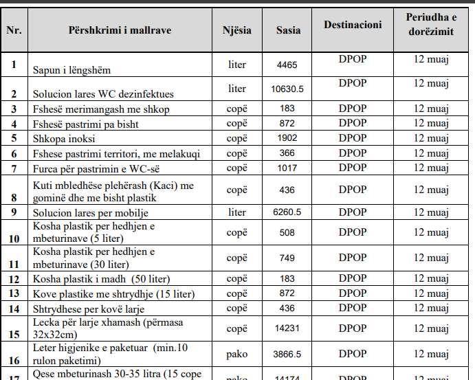 Lista përmban produkte të tilla si sapun i lëngshëm, solucion larës WC dezinfektues, fshesë merimangash me shkop, fshesë pastrimi, furça për pastrimin e WC-së, solucion larës për mobilje, kosha plastik për hedhjen e mbeturinave, kove plastike me shtrydhje, lecka për larje xhamash, letër higjienike (38665 copë) qese mbeturinash etj.