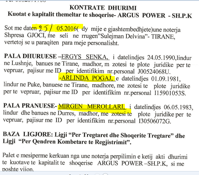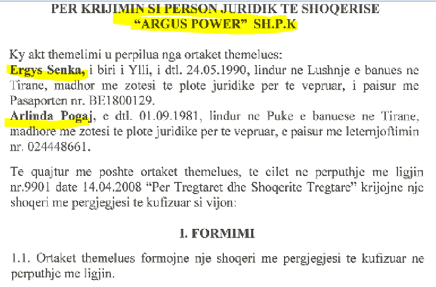 Kompania “ARGUS POWER” Sh.p.k. u krijua në 6 maj 2014 në Tiranë me seli tek pallatet “Agimi”. Njëri themelues ishin Ergys Senka (në atë kohë vetëm 24 vjec), por që biznesin e kishte në gjak, sepse është i biri i oligarkut Ylli Senka. Ky do të ishte në këtë kompani 51% të aksioneve. Themeluesja tjetër, që kishte 49% të pjesëve, ishte Arlinda Pogaj.