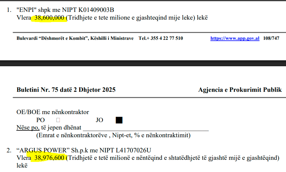 Bëhet fjalë për kompanië “ENPI” shpk që kishte bërë ofertën 38,600,000 lekë pa TVSH. Nëse nuk do të tërhiqej nga gara, kjo kompani do të komplikonte vendimmarrjen e komsionit, sepse “ARGUS POWER” Sh.p.k me “pronar” Mirgen Merollarin kishte ofruar vlerë më të lartë: 38,976,600 lekë pa TVSH.