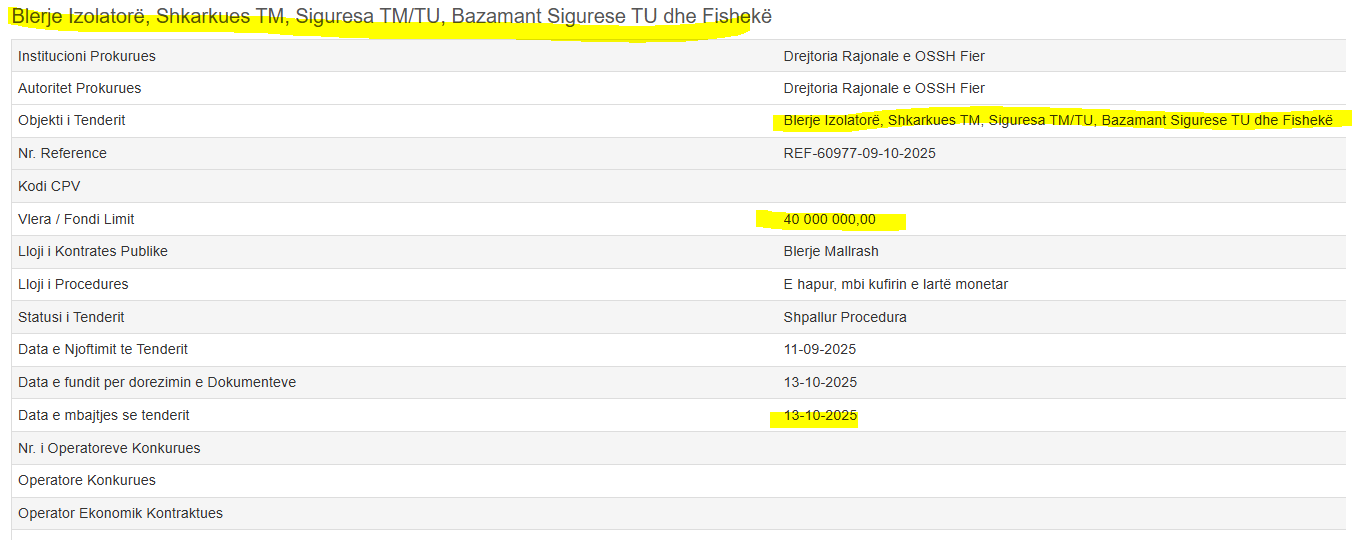 Më konkretisht bëhet fjalë për tenderin me objekt “Blerje Izolatorë, Shkarkues TM, Siguresa TM/TU, Bazamant Siguresë TU dhe Fishekë” me fond limit 400 milionë lekë të vjetra pa TVSH.