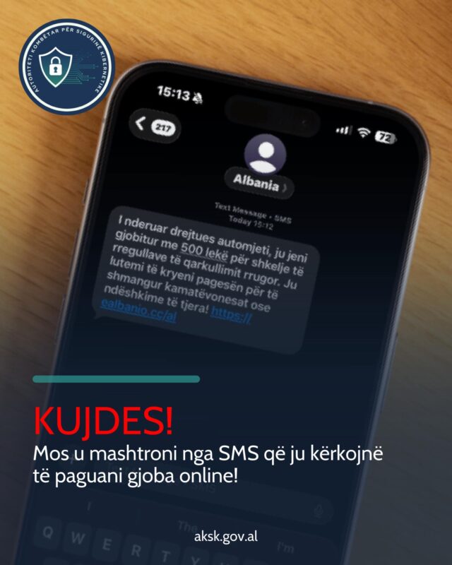 Autoriteti Kombëtar për Sigurinë Kibernetike (AKSK) informon se po qarkullon një mesazh “smishing” që synon të mashtrojë qytetarët me gjoba të rreme për shkelje të rregullave të qarkullimit rrugor.