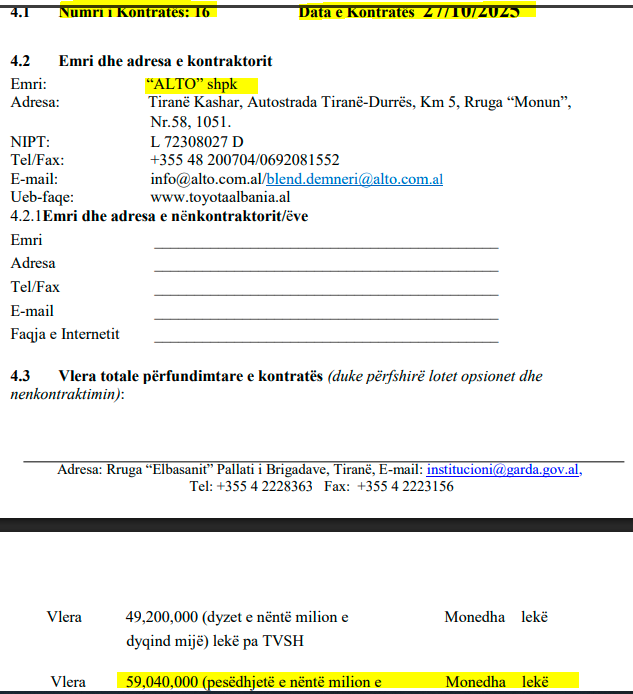 Sipas dokumenteve, vlera totale përfundimtare e kontratës është 49,200,000 lekë pa TVSH, ndërsa me TVSH shifra e fiksuar mes palëve është 59,040,000 lekë.