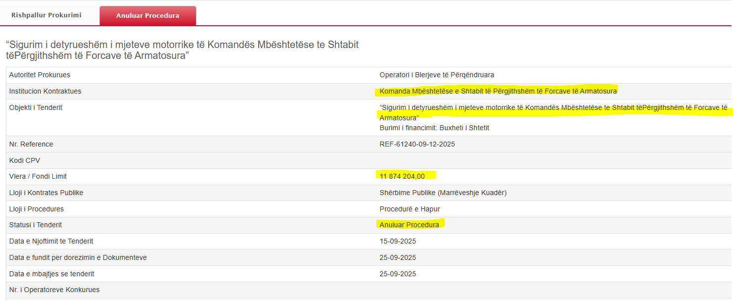 Ky tender ishte anuluar një herë më parë, pasi ishte shpallur më 15 shtator 2025 dhe duhet të ishte mbajtur më 25 shtator. Nuk mundëm të mësojmë arsyet e anulimit të tenderit, por kjo ishte shenja e parë se procedura po zhvillohej pa transparencë.