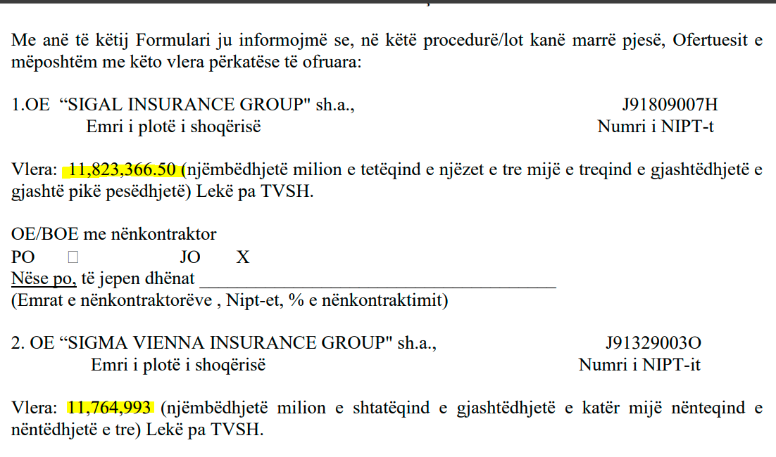 Në tender ka marrë pjesë edhe “SIGMA VIENNA INSURANCE GROUP” sh.a. që ka bërë ofertë më të ulët: 11,764,993 Lekë pa TVSH.