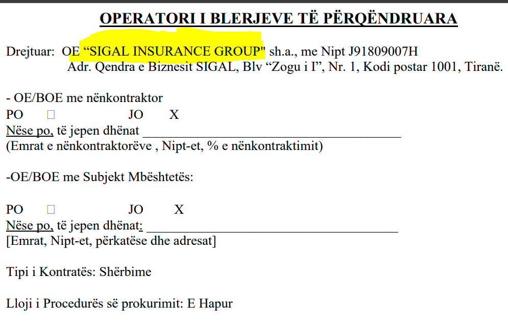 “Sigurimi i disa sistemeve të informacionit dhe komunikimit që i shërbejnë aplikimit të teknologjisë në zgjedhje”, kështu quhet kontrata mes Ilirjan Celibashit dhe Avni Ponarit. Nuk dihen detajet e prokurimit, se cilat lloje të dëmeve mbulon Sigali, dhe në cilën masë do të jetë dëmshpërblimi. Po ashtu nuk dihet se kush e konstaton ngjarjen dhe si bëhet vlerësimi. Gjithsesi kontrata është lidhur tashmë dhe Thesari i Shtetit do të ketë bërë xhirimin e parave në llogarinë e Sigalit.