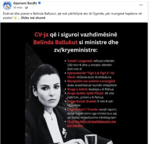 Në një postim në rrjetet sociale, Bardhi ironizoi Ballukun për “ëndrrat dhe planet” e saj personale, ndërsa sipas tij, vetëm në 6 projekte të saj korruptive, “vlera e vjedhjes arrin sa buxheti vjetor i Bashkisë së Tiranës”.