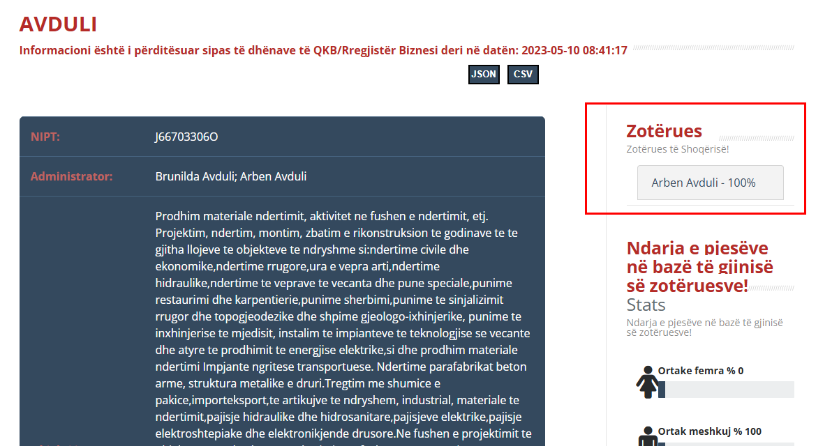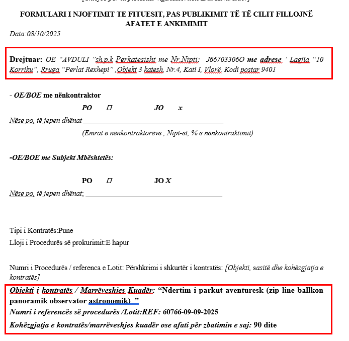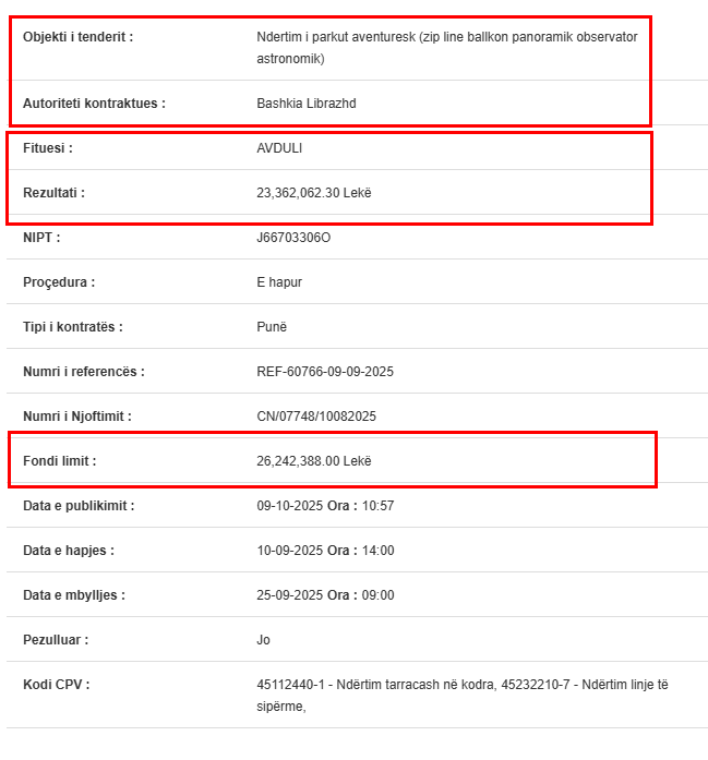 Sipas të dhënave zyrtare nga Agjencia e Prokurimit Publik, tenderi me numër reference REF-60766-09-09-2025, me objektin “Ndërtim i parkut aventuresk (zip line, ballkon panoramik, observator astronomik)”, është shpallur fitues nga kompania AVDULI, në pronësi të biznesmenit Arben Avduli.