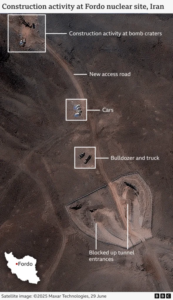 Eksperti i armëve bërthamore, David Albright, i cili ka analizuar imazhet e të njëjtit vend të realizuara më 28 qershor, thotë se punimet ndërtimore mund të përfshijnë mbushjen e kraterëve, vlerësime inxhinierike për dëmet dhe mbledhjen e mostrave për ndotjen radiologjike.