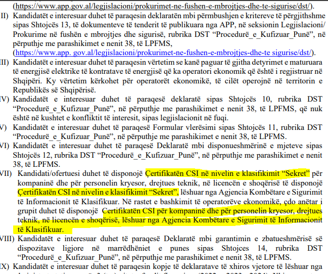Ndërkaq, ofertuesi duhet të disponojë Çertifikatën CSI në nivelin e klasifikimit “Sekret” për kompaninë dhe për personelin kryesor, drejtues teknik, në licencën e shoqërisë të disponojë Çertifikatën CSI në nivelin e klasifikimit “Sekret”, lëshuar nga Agjencia Kombëtare e Sigurimit të Informacionit të Klasifikuar.