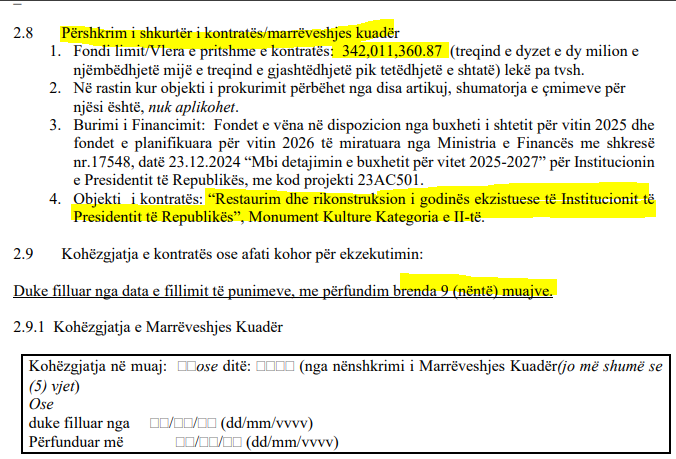 Objekti i kontratës së shpallur është emërtuar “Restaurim dhe rikonstruksion i godinës ekzistuese të Institucionit të Presidentit të Republikës”, Monument Kulture Kategoria e II-të.
