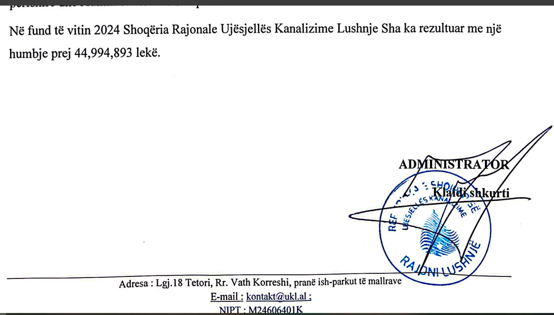 Ndërsa humbja e shoqërisë në vitin 2024 është gati trefish më e lartë: 44 994 893 lekë. Më poshtë është dokumenti i bilancit financiar i firmosur nga drejtori Klaidi Shkurti.