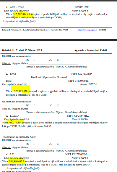 Ndërkohë, operatori ekonomik “ALB – STAR” shpk prezantonte vlerën 315,302,894 lekë pa TVSH. Ndërsa “ERGI” shpk propozonte ofertën 326,915,570 lek pa TVSH.
