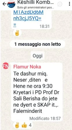 Berisha do të jetë në SPAK për të zbatuar masën “detyrim paraqitje”. Më poshtë është mesazhi i Nokës në grupin e Whatssap të Këshillit Kombëtar.