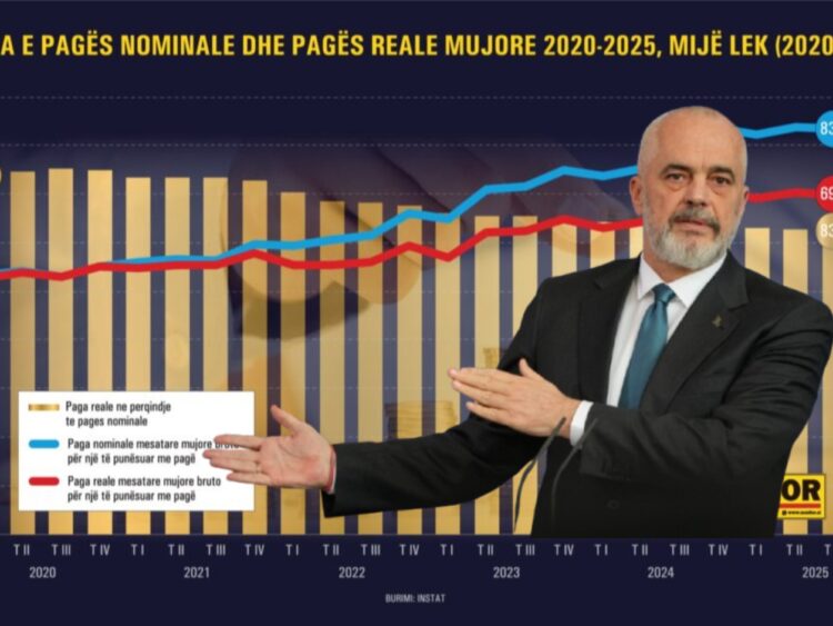 Paga nominale u rrit ndjeshëm, nga rreth 60 mijë lekë në vitin 2022 në mbi 83 mijë lekë në vitin 2024 dhe fillim 2025. Megjithatë, paga reale rritet shumë më ngadalë dhe në disa tremujorë madje shënon rënie krahasuar me ritmin e pagës nominale. Raporti i pagës reale ndaj pagës nominale bie në mënyrë të vazhdueshme, duke zbritur nga rreth 94% në fillim të vitit 2022 në rreth 83–83% në vitet 2024–2025. Kjo tregon se një pjesë gjithnjë e më e madhe e rritjes së pagave po gërryhet nga inflacioni.