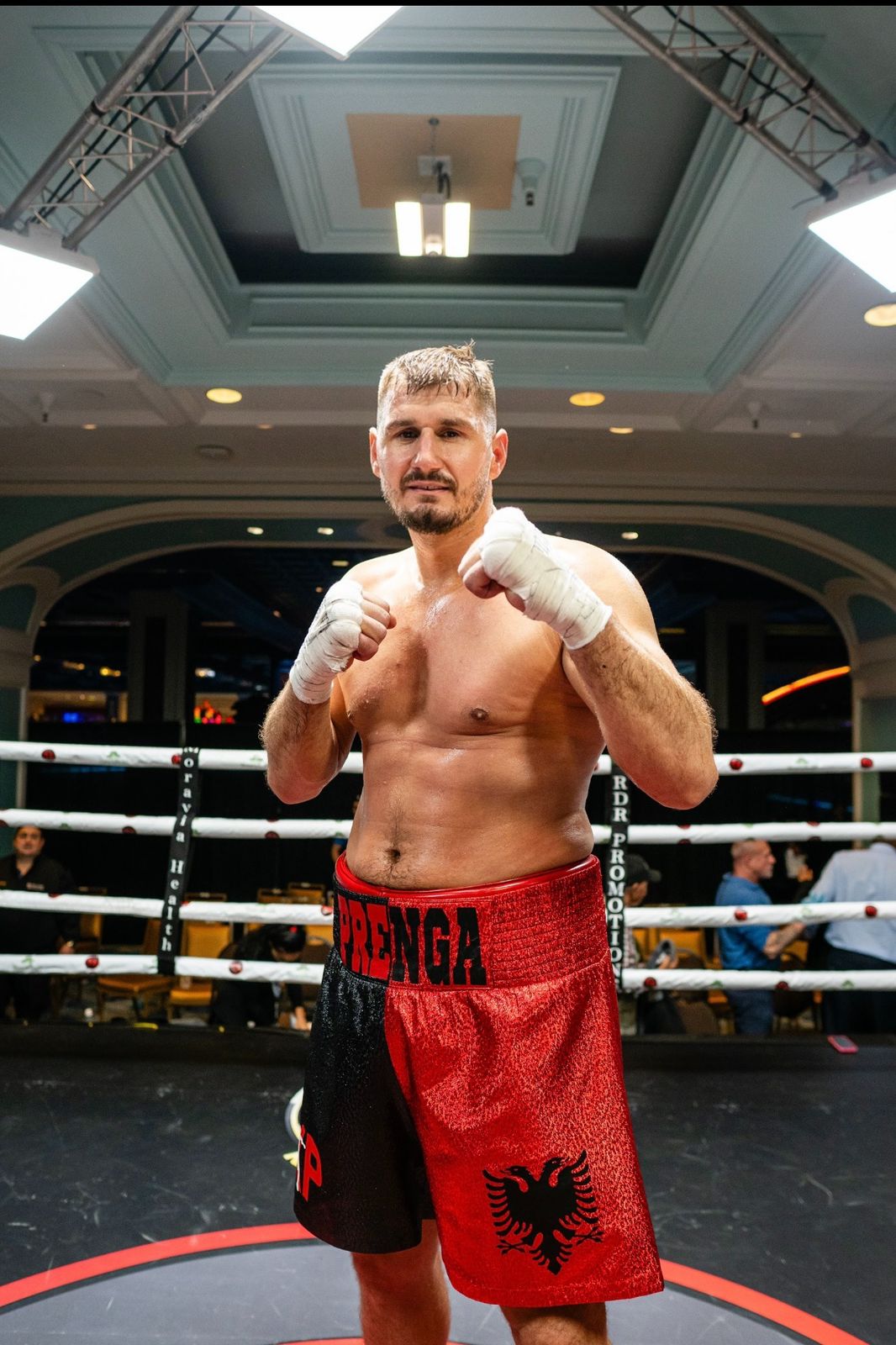 Atmosfera në arenën e boksit në Atlantic City ishte elektrizuese. Shqiptarët e Amerikës kishin mbushur tribunat për të mbështetur kampionin nga Mirdita, duke e duartrokitur dhe brohoritur me krenari emrin e tij gjatë gjithë ndeshjes. Mbështetja dhe entuziazmi i tyre u ndjenë fuqishëm në çdo moment të përballjes.