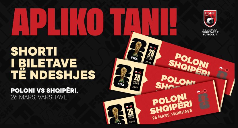 Federata e Futbollit njofton të gjithë tifozët se është hapur procesi i aplikimit për shortin e biletave për ndeshjen Poloni – Shqipëri, e vlefshme për fazën play-off të Kampionatit Botëror 2026, që do të luhet më 26 mars në Varshavë.