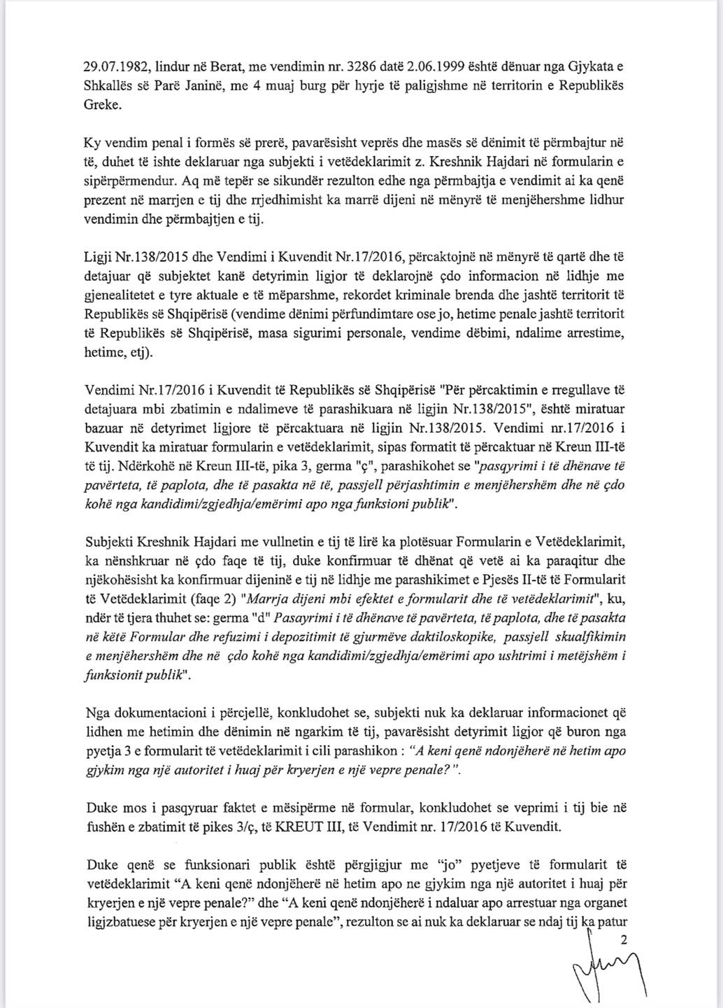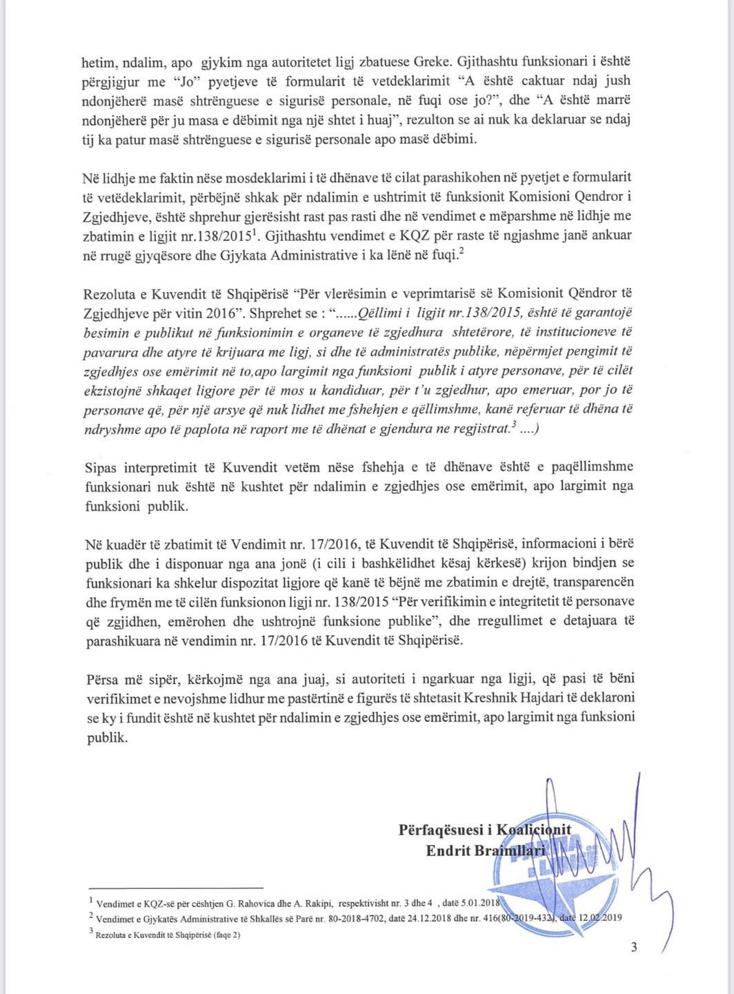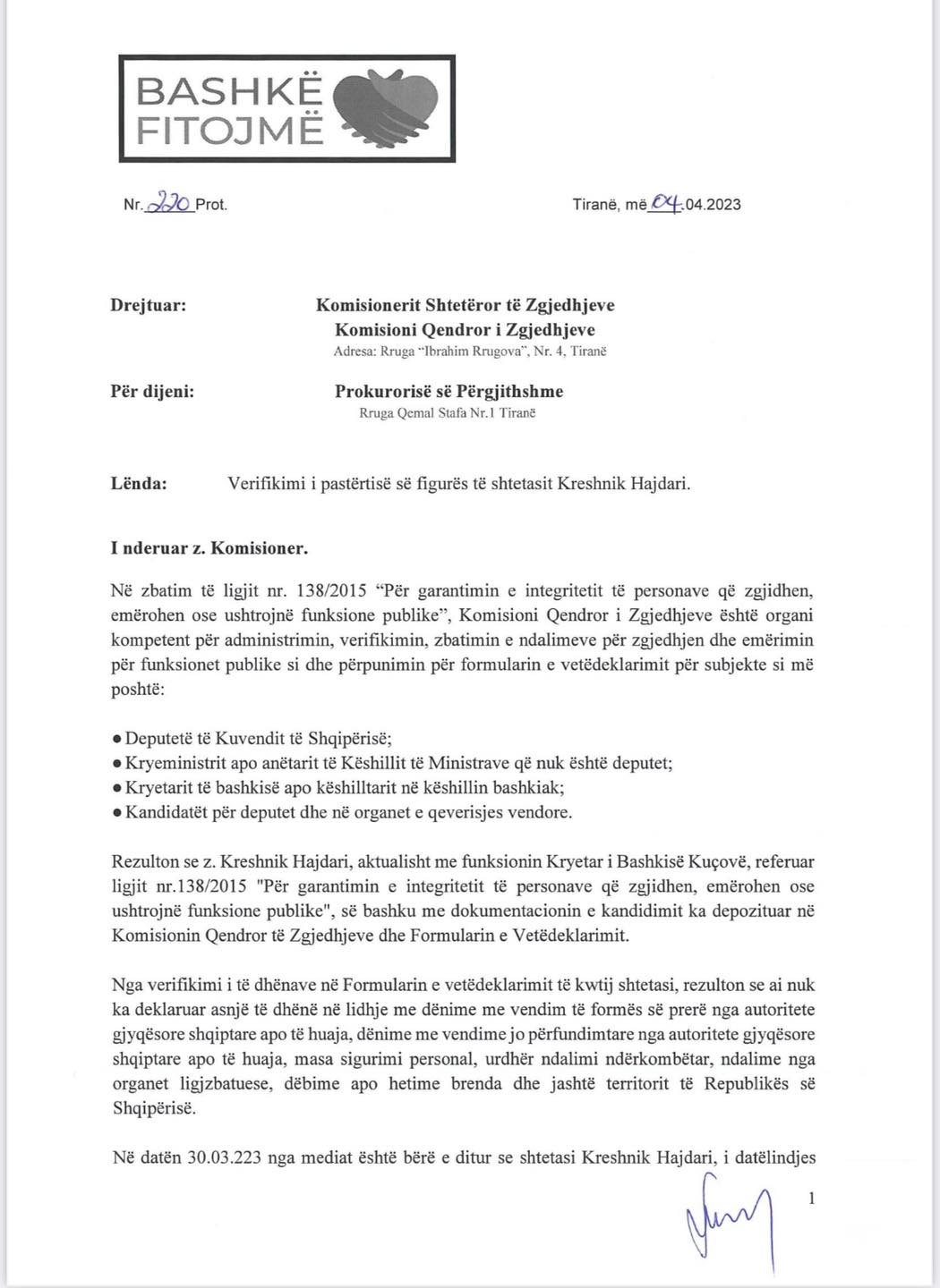 “Në emër të Koalicionit “Bashkë Fitojmë” i jemi drejtur Komisionit Shtetëror të Zgjedhjeve dhe Prokurorisë së Përgjithshme në datë 04.04.2023, mbi verifikimin e pastertisë së figurës së shtetasit Kreshnik Hajdari që në këtë rast është kryetari në detyrë dhe Kandidati i Bashkisë Kuçovë për kryetar bashkie në rradhët e Rilindjes, i cili në formularin e vetëdeklarimit ka fshehur deklarimin e dënimit penal në shtetin grek, fakt ky që “sjell përjashtimin e menjëhershëm dhe në çdo kohë nga kandidimi, zgjedhja, emërimi apo nga funksioni publik”.
