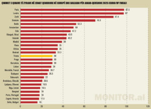 Në Zagreb të Kroacisë çmimet janë 17.5 dhe në Sofje të Bullgarisë 16 euro për metër katror në muaj.