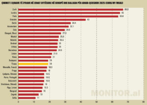 Tirana pozicionohet ndër qytetet më të shtrenjta edhe për çmimet e qirave në zonat sekondare. Me një mesatare prej 19 euro për metër katror në muaj, kryeqyteti shqiptar tejkalon disa qytete të rajonit si Beogradi (15 euro), Zagrebi (13 euro) dhe Sofia (11 euro).