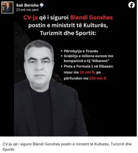 Kreu i Partisë Demokratike Sali Berisha ka publikuar CV e ngritjes në Detyra të Blendi Gonxhes, njëri nga ministrat e preferuar të Ramës, bashkëpunëtor i këtij të fundit që nga koha kur drejtonte bashkinë e Tiranës.
